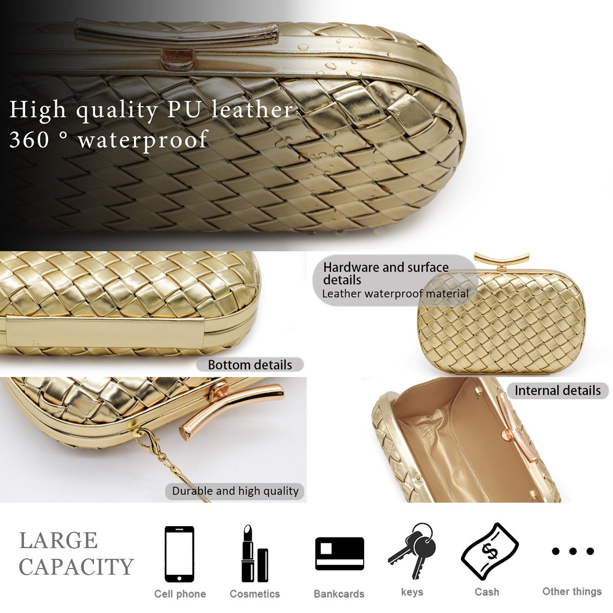 🌼【Material】 Our white evening clutch purses is made of soft PU leather, hand-woven, and have a high-quality gold decoration, durable, smooth, exquisite, fashionable, and personalized geometric shape.