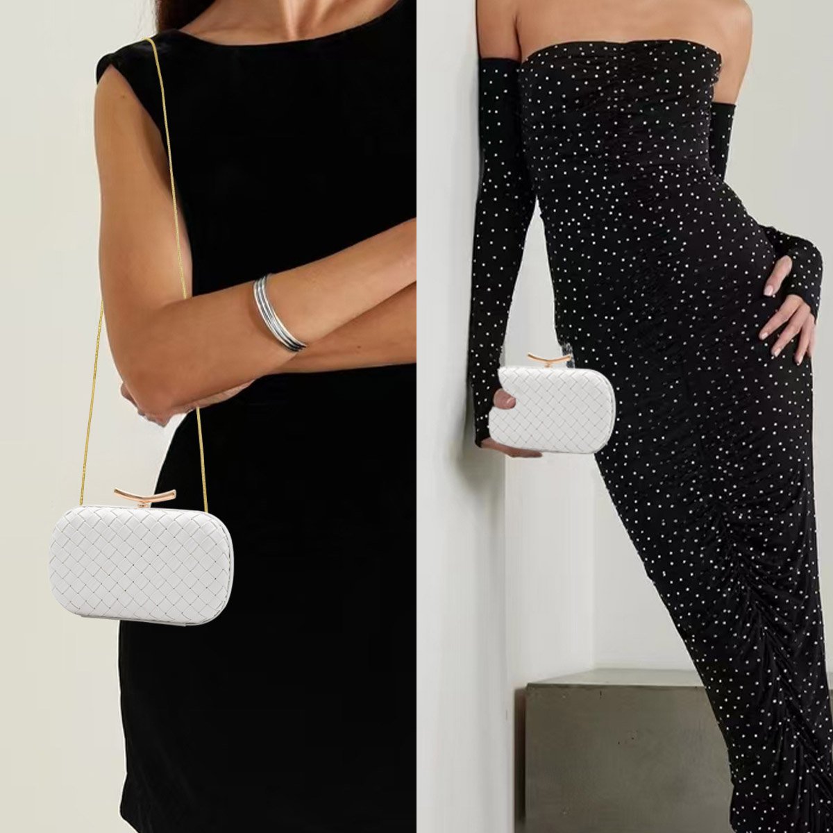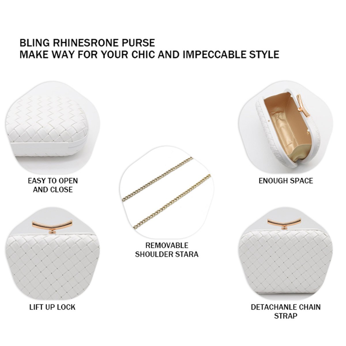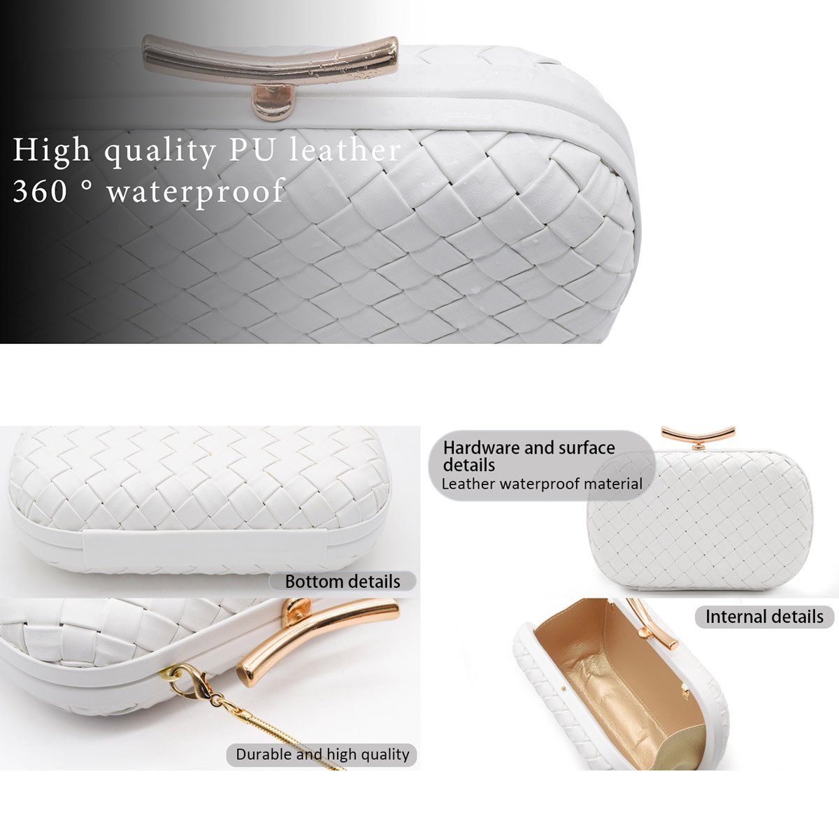 🌼【Material】 Our white evening clutch purses is made of soft PU leather, hand-woven, and have a high-quality gold decoration, durable, smooth, exquisite, fashionable, and personalized geometric shape.