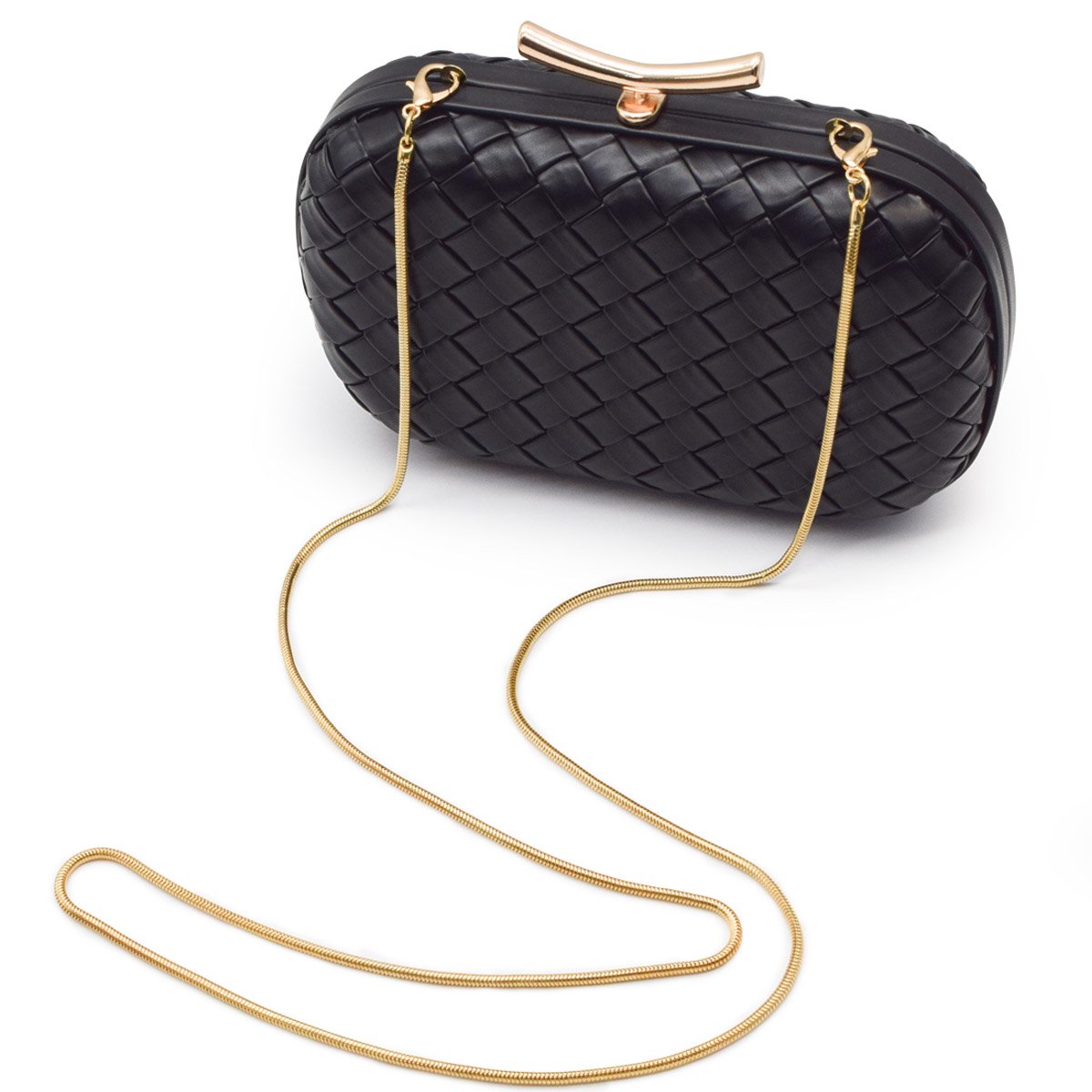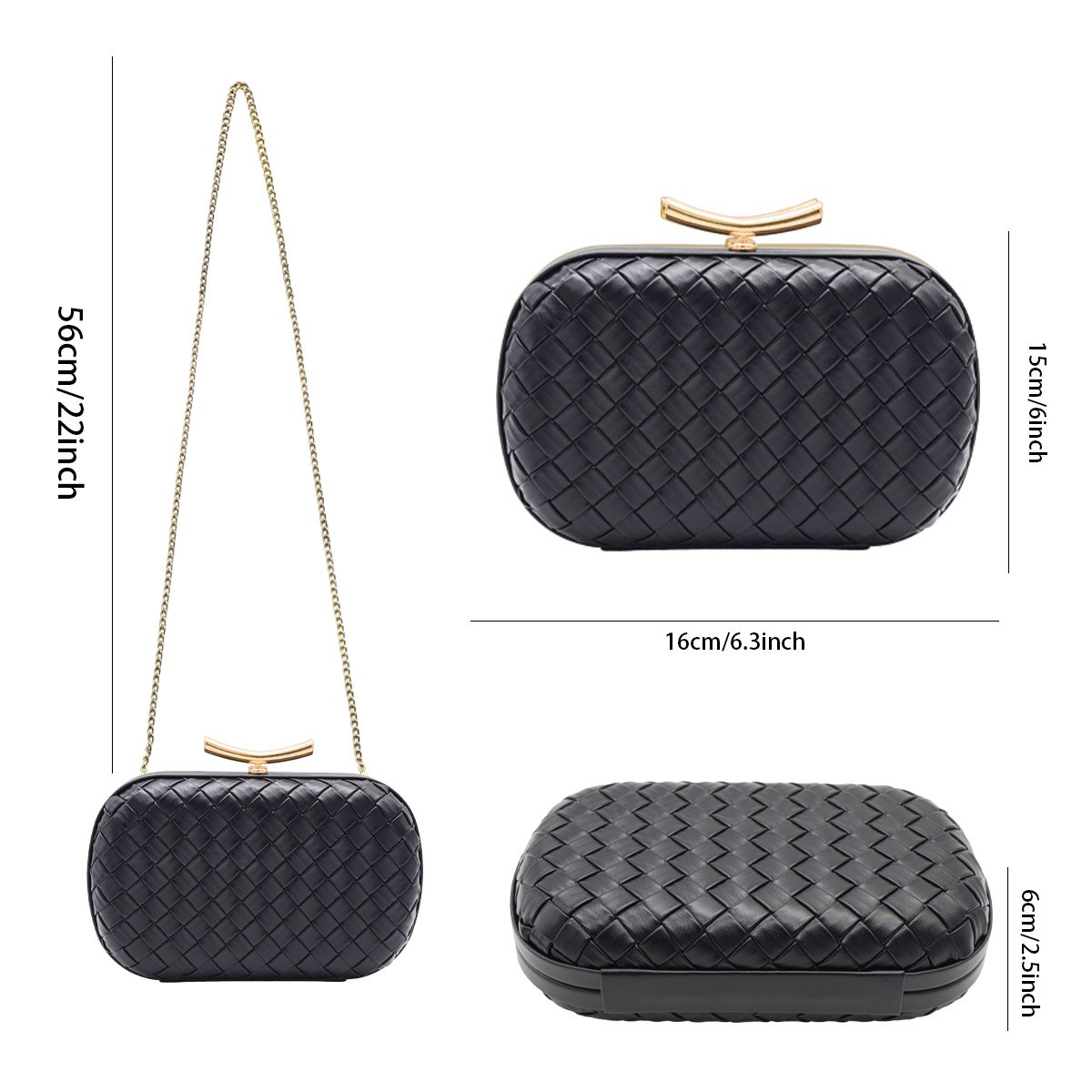 PU Leather Woven Wedding Guest Clutch Metal Chain Shoulder Crossbody Bag Black