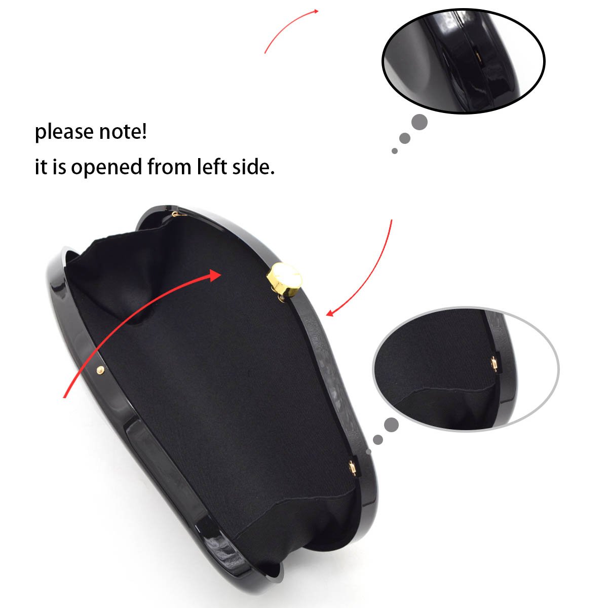 【Material】 Our evening clutch is made of high-end acrylic, with a layer of metal paint electroplated on the surface, which is not easy to fade, durable, smooth, exquisite, and fashionable. Adopting a magnetic buckle closure method for easy opening.