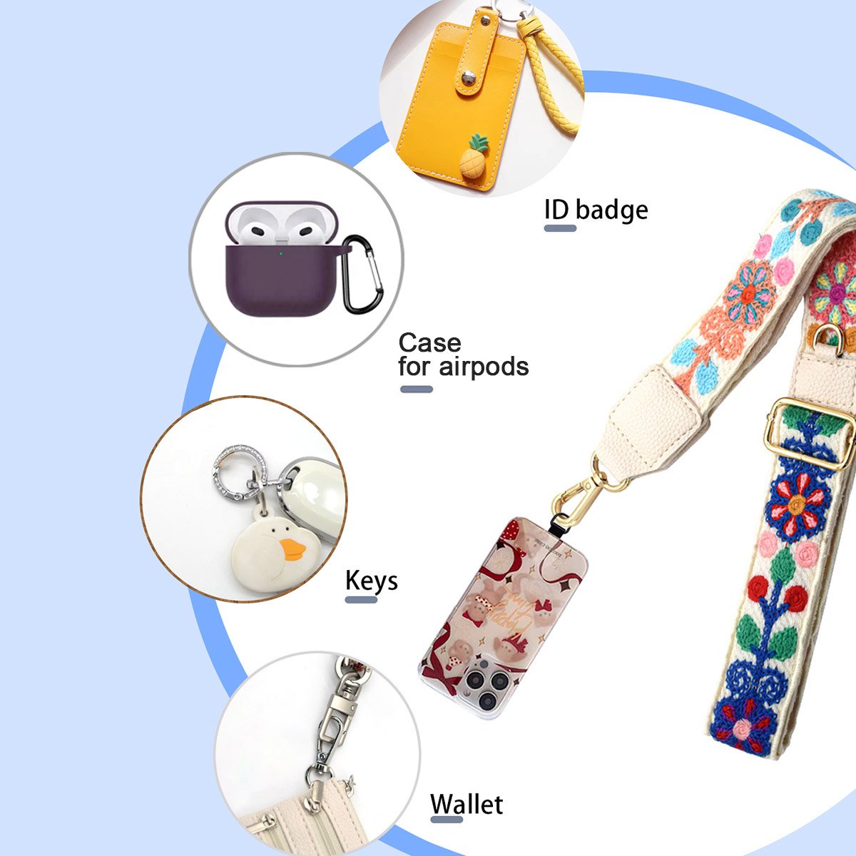 - PERSONALITY PATTERN: The unique embroidery pattern and cute style of the phone strap can meet your personalised look and make your phone more attractive. In addition to cell phones, your keys, ID case, wallets, headphones, bag and cameras are equally applicable.